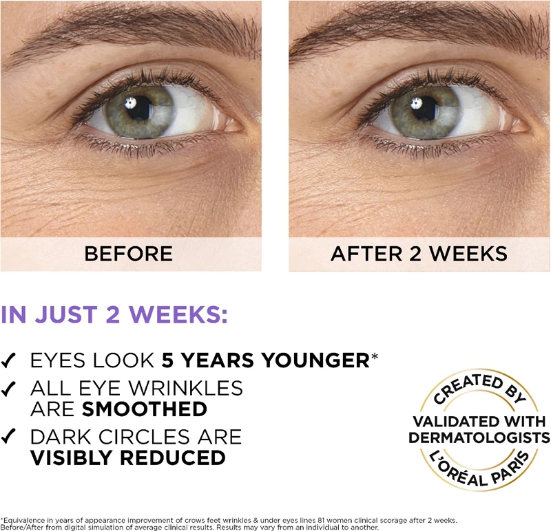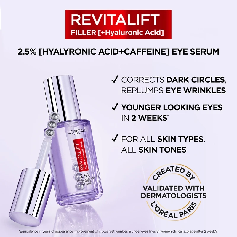 Le sérum pour le contour des yeux L’Oréal Paris Revitalift Filler vous aidera à obtenir une apparence visiblement plus jeune. Grâce aux effets constatés par les utilisateurs, ce sérum contenant 2,5 % d’acide hyaluronique et de la caféine est devenu un produit phare parmi les soins du contour des yeux. Grâce à sa teneur en acide hyaluronique macro et micro, il apporte une profonde hydratation, tandis que la caféine et la niacinamide neutralisent les cernes et les poches sous les yeux.