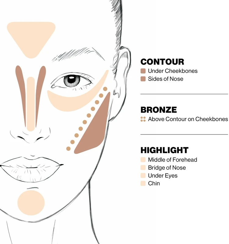 À l’aide du pinceau inclus dans l’emballage, appliquez la poudre sur le visage. Appliquez la teinte la plus sombre sur les côtés du nez et sous les pommettes. Appliquez la poudre bronzante sur les pommettes. Appliquez l’enlumineur au milieu du front, à la limite du nez, sous les yeux et au milieu du menton.